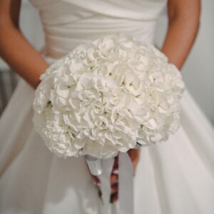 Bidermajer sa belim ruzama, božurom, frezijama i lizijantusom.